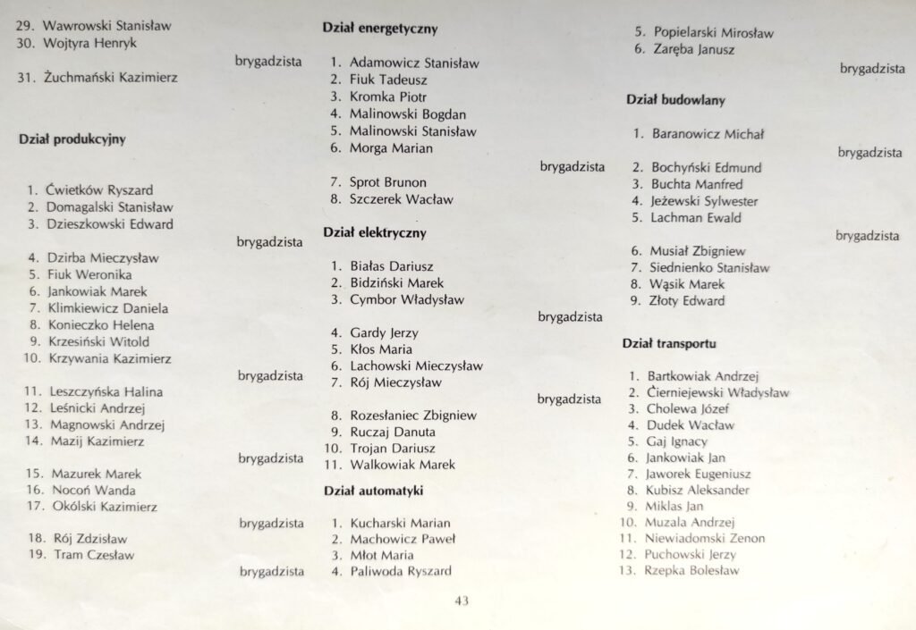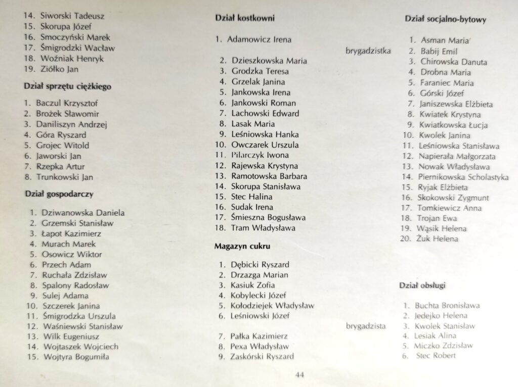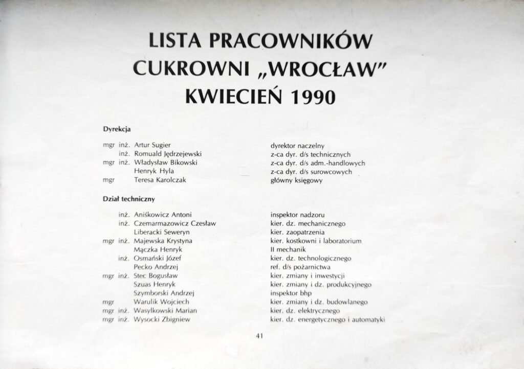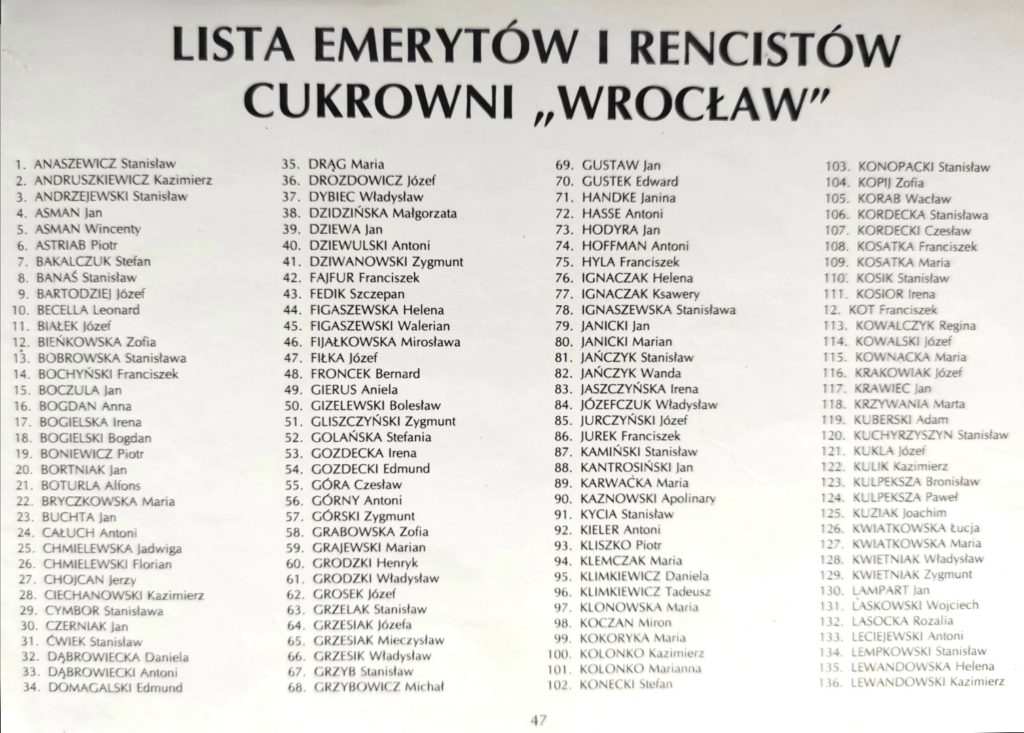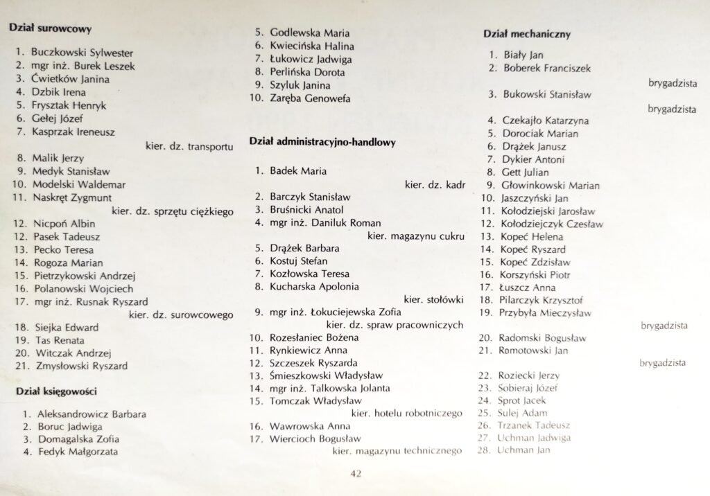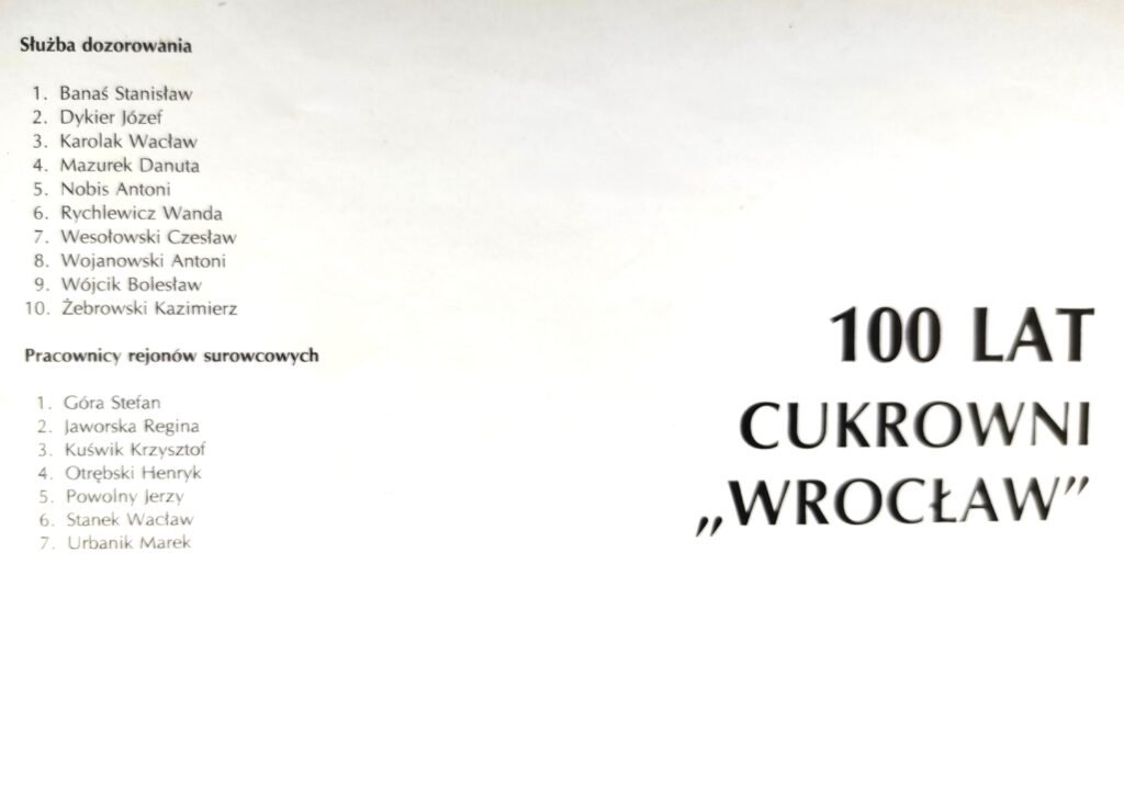 Lista obejmuje pracowników oraz emerytów i rencistów związanych z cukrownią do 1990 roku. W kolejnych latach lista ta ulegała systematycznym zmianom, jednak wyłącznie w jednym kierunku – liczba zatrudnionych stopniowo malała. Do 2008 roku proces ten był wyraźnie zauważalny, a redukcja etatów następowała wraz z postępującymi zmianami organizacyjnymi.